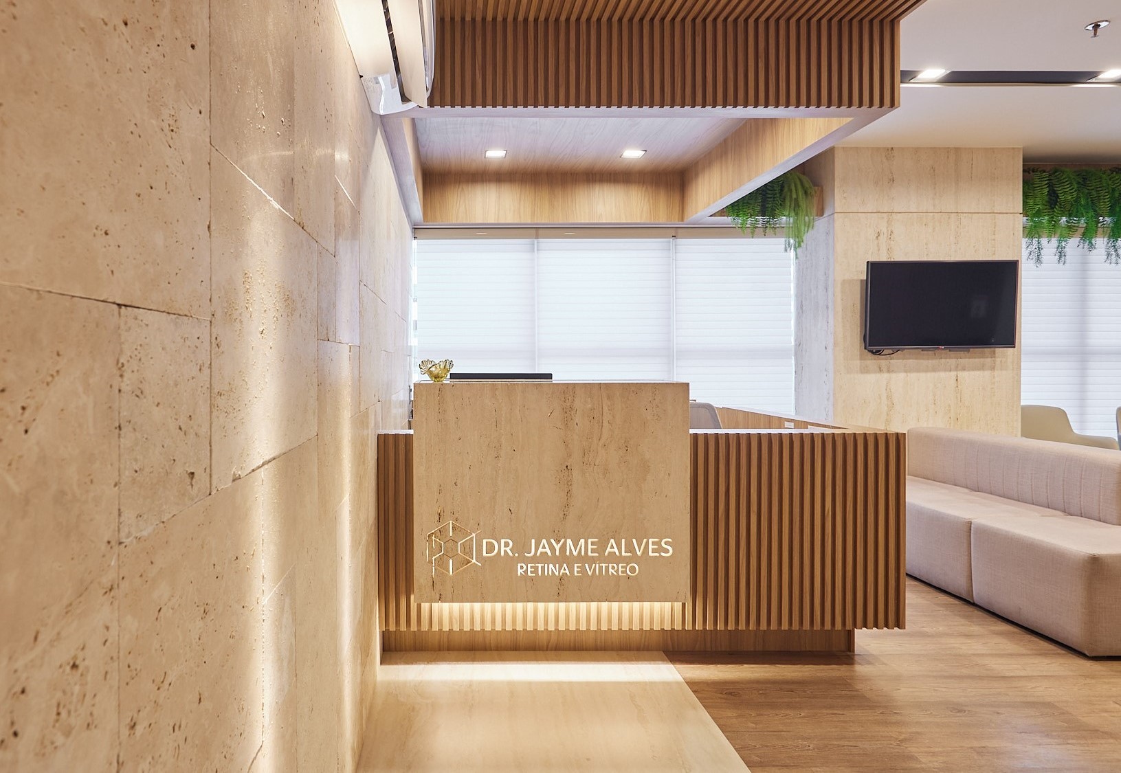 A atemporalidade do clássico com toque contemporâneo foi a aplicação de materiais nobres como mármore Travertino Romano, Carrara e Macchia Oro, num design e linguagem minimalistas. Todo mobiliário embutido é assinado pelo escritório, desde o imponente balcão da recepção com letreiro esculpido e iluminado de mármore às mesas de atendimento, móveis com cubas e lixeiras embutidas, armários para amostras de medicação, painéis e toda necessidade particular da rotina da clínica. Resultado elegante, sóbrio e sofisticado.